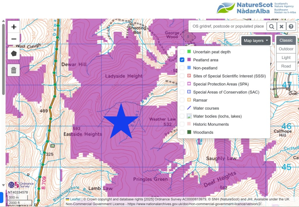 According to the peat depth map that NatureScot has provided to help grouse moor managers determine peat depth for licensing purposes, this area is bang in the middle of an area defined in Scottish legislation as ‘deep peat’ (peat depth of 40cm+).