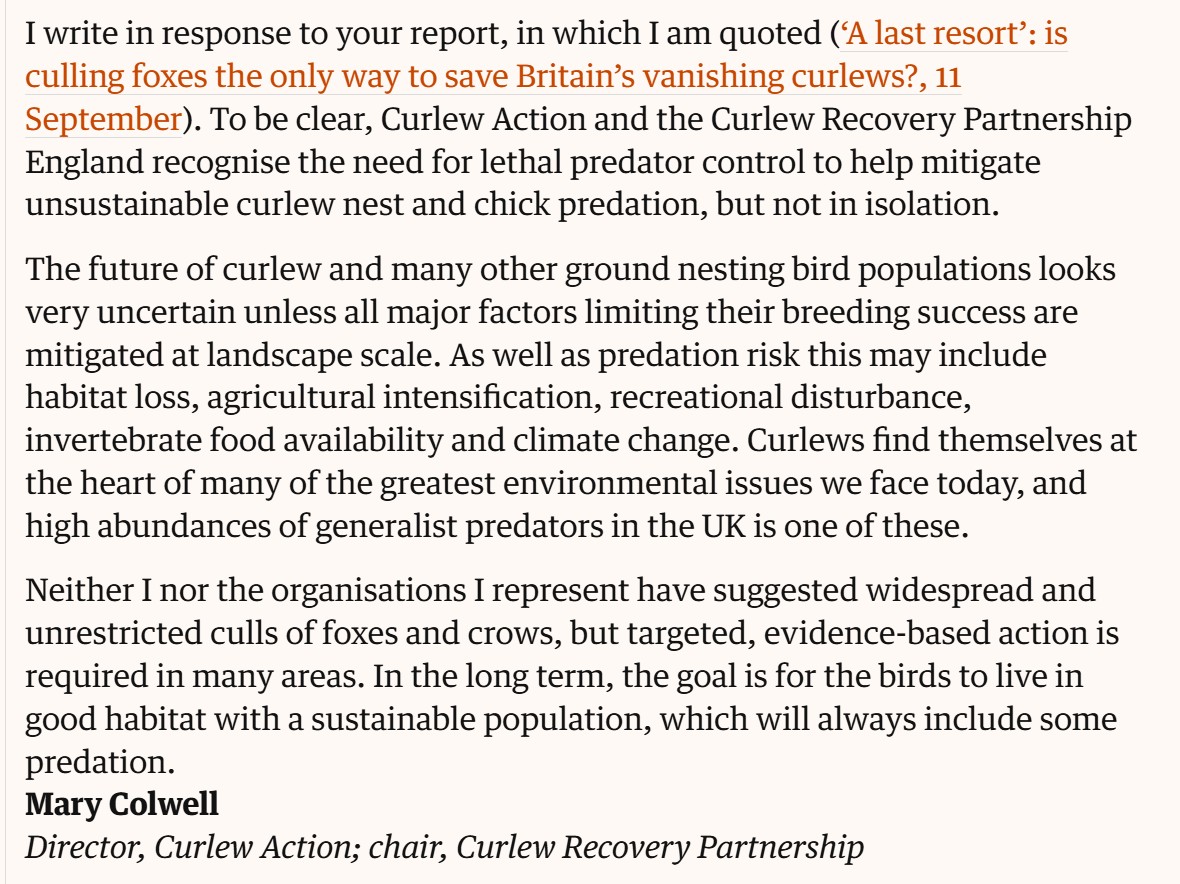 I was asked by The Guardian journalist (Helena Horton) to comment on the proposition of widespread Fox and Crow culling for Curlew conservation and Helena duly included my quote, in full, in her article: