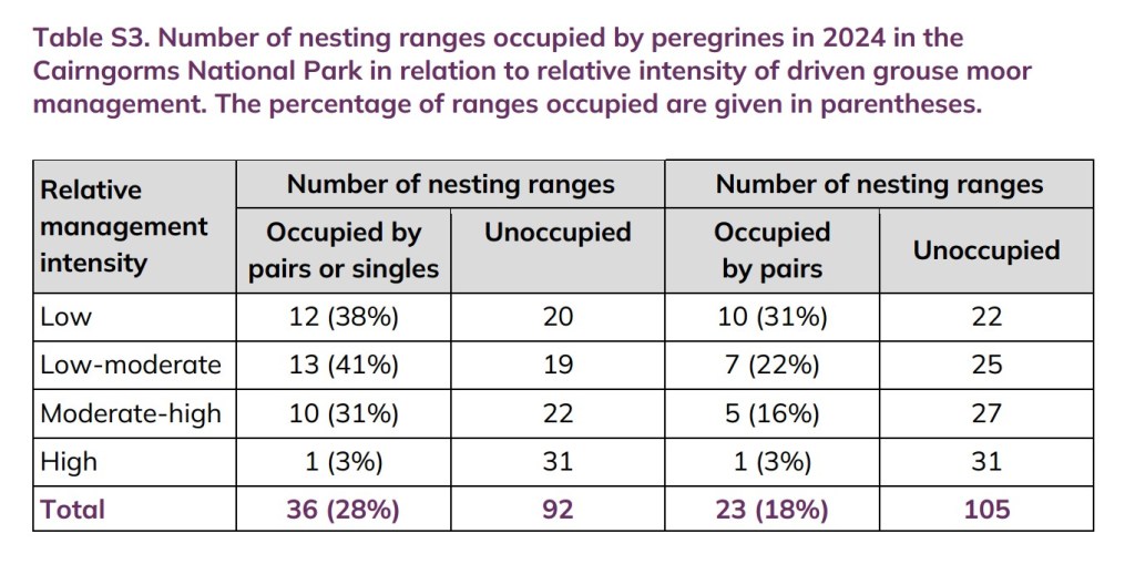The latest report includes an analysis of the relationship between Peregrine breeding site occupancy and the intensity of grouse moor management (ranging from ‘low’ to ‘high’ management intensity and everything in between).
