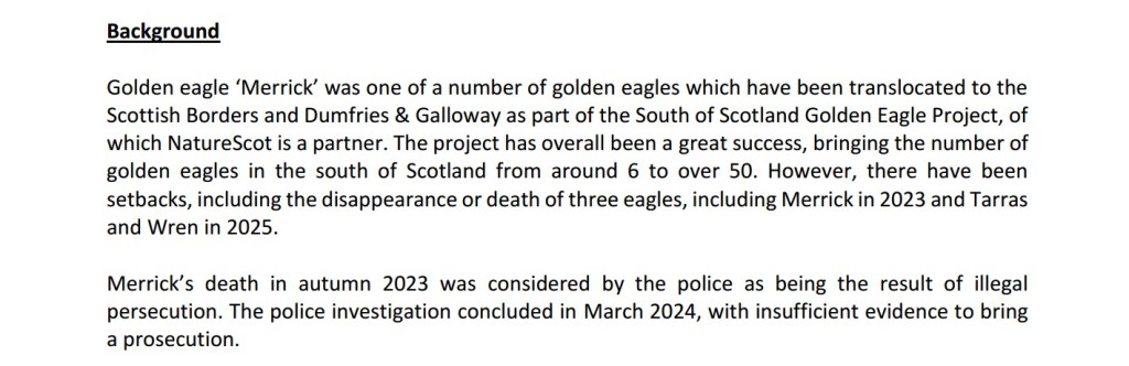 The Scottish Government’s nature advisory agency, NatureScot, has been now been procrastinating for over 18 months on whether to impose a sanction on an estate in relation to the ‘shooting and killing’ of a sleeping Golden Eagle called Merrick. But apparently a decision is now expected “in the next few weeks”.
