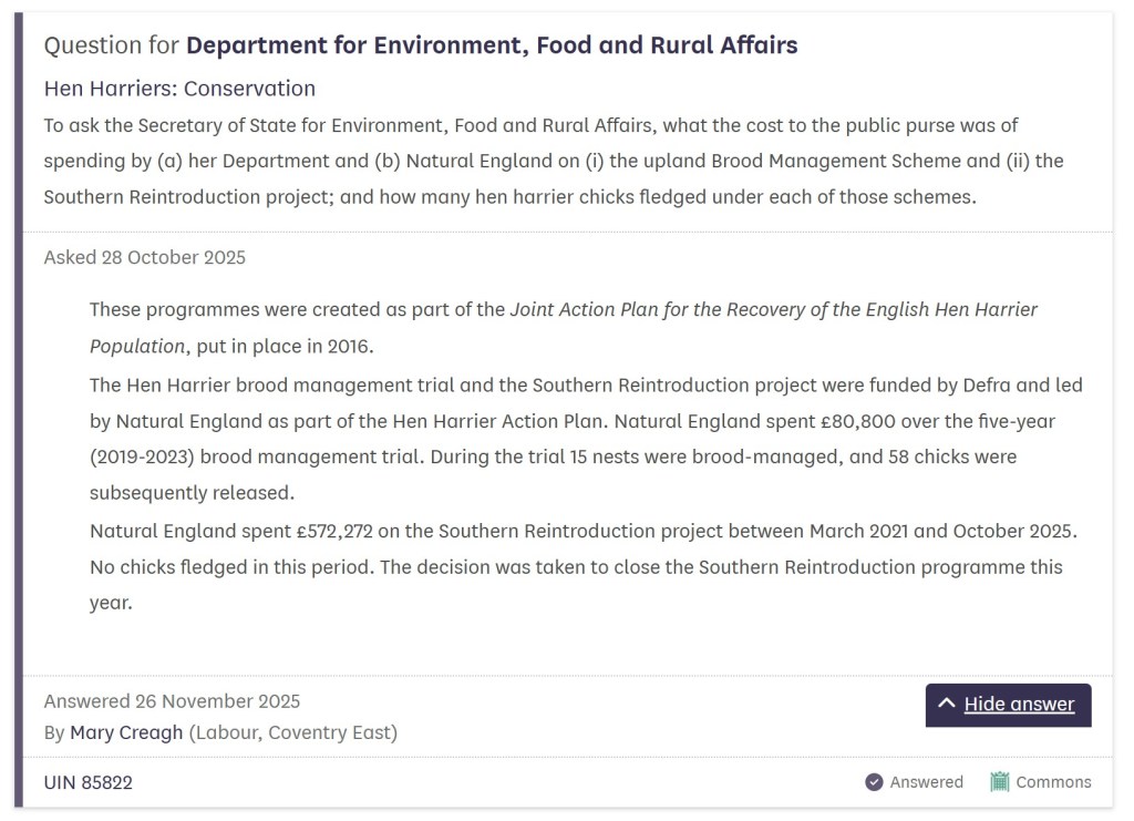 The first we knew about this was in Natural England’s intermittent spreadsheet update in December 2024 about the fate of the Hen Harriers that had been satellite-tagged using public funds. Margaret’s entry read as follows: