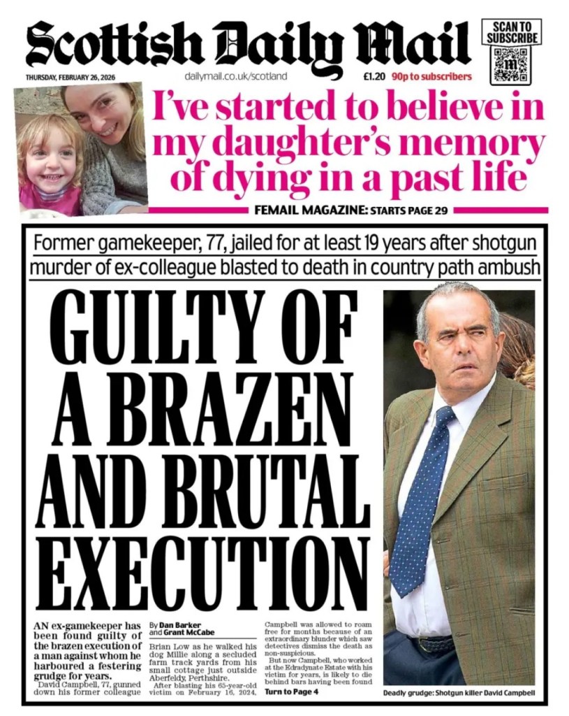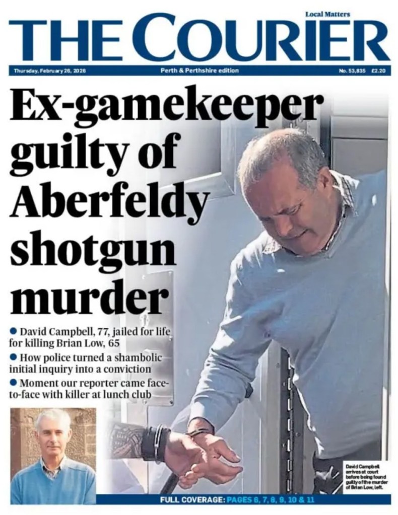 Two days ago, a jury at the High Court in Glasgow returned a guilty verdict in the trial of former Head Gamekeeper David Campbell, 77, who had been accused of murdering his ex-colleague from Edradynate Estate, Brian Low, after ambushing him and shooting him in the chest and neck with a shotgun on a remote woodland track near Aberfeldy on 16 February 2024.