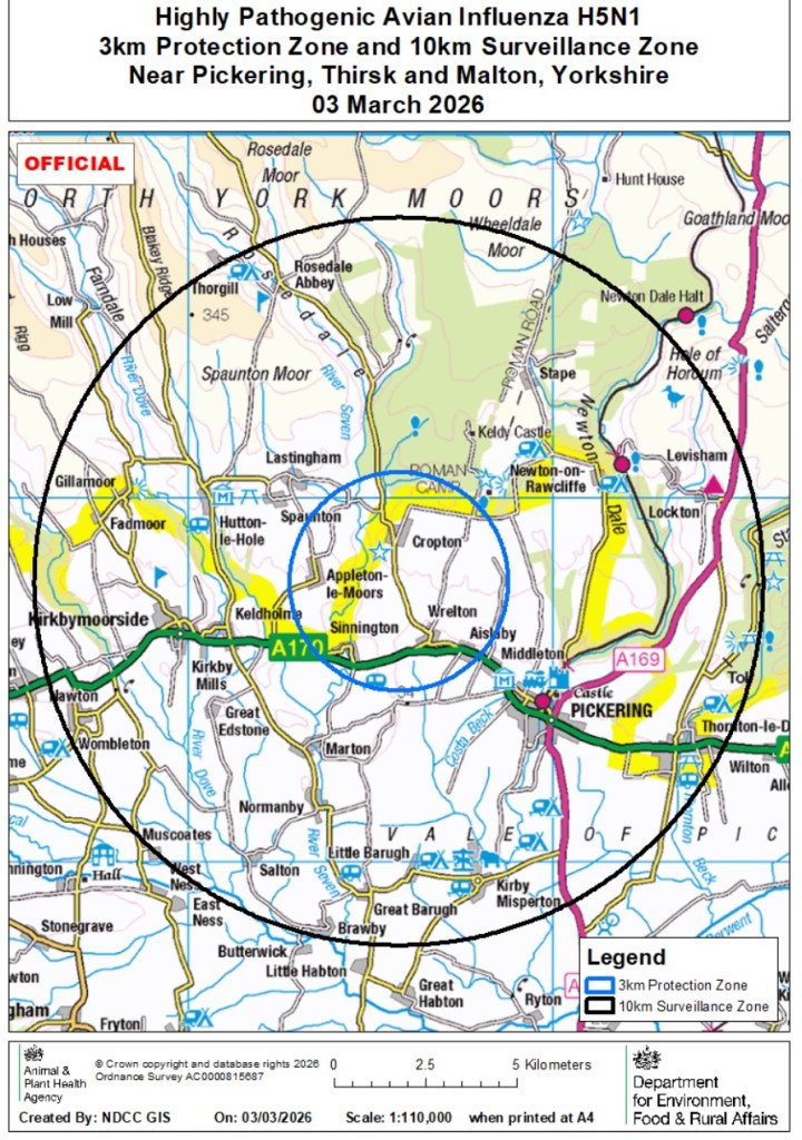 A 3km Protection Zone and a 10km Surveillance Zone have been declared around Westfield Farms, near Cropton and all gamebirds on the premises will be humanely killed.