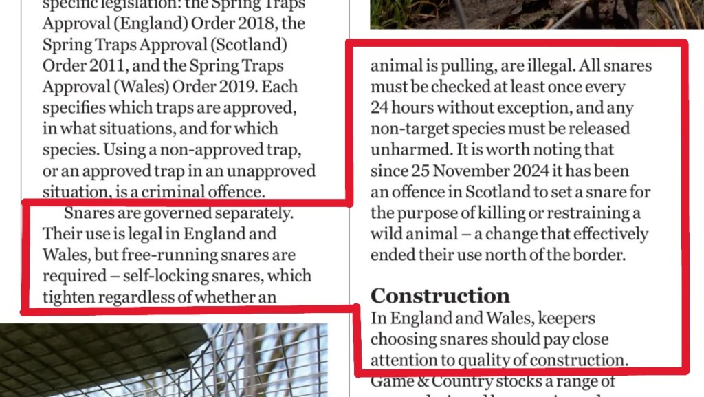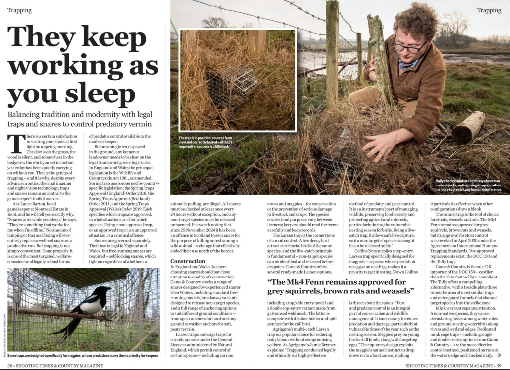 In this week’s edition of Shooting Times, ‘the official weekly journal of BASC’, there’s a three-page article all about trapping, apparently ‘balancing tradition and modernity with legal traps and snares to control predatory vermin‘.