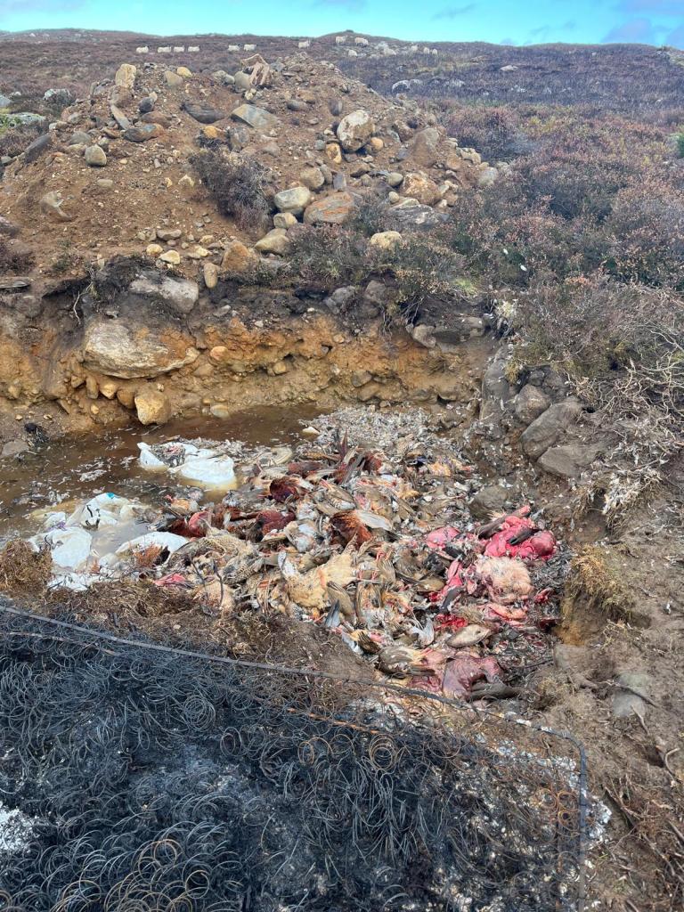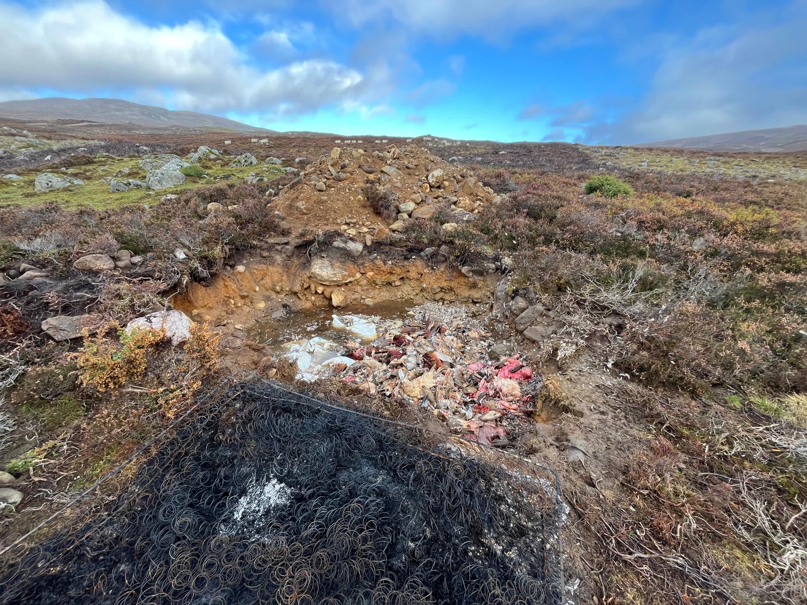 A large pit containing dead Pheasants, Red-legged Partridges, Wood Pigeons, deer parts, and a lot of rubbish, including a burnt mattress, has been found on a shooting estate in the Cairngorms National Park.