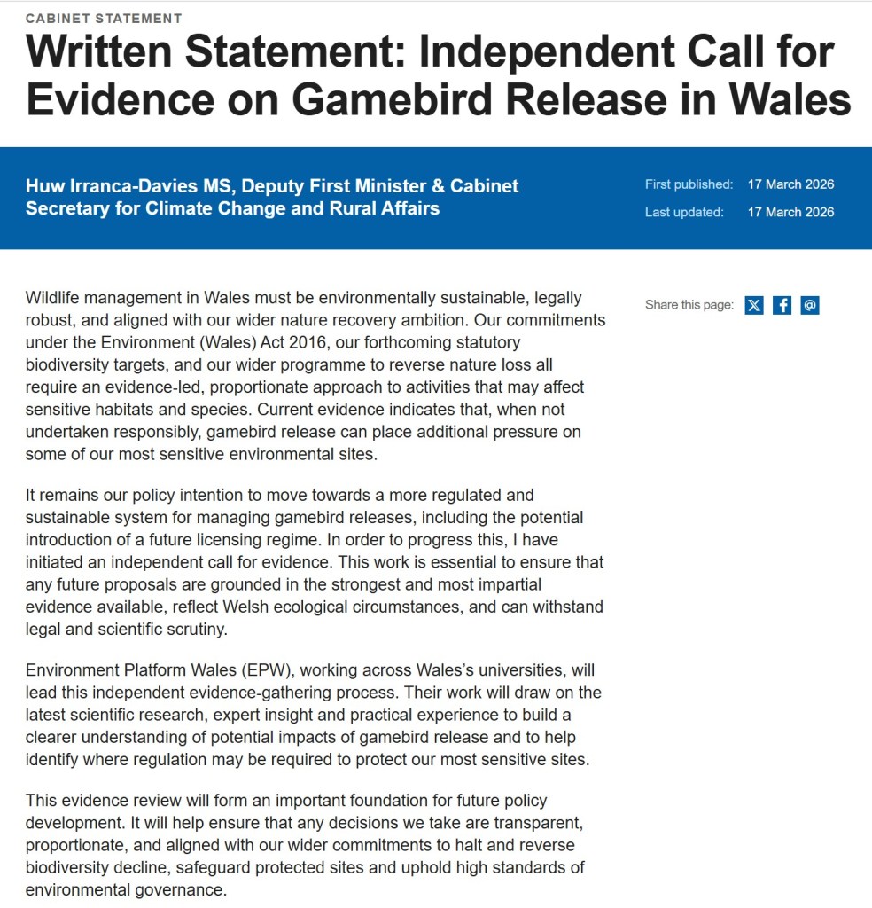 I don’t know why the Welsh Government is calling for yet another evidence review; it surely has sufficient evidence by now to just get on with the job. Although I suspect it is probably in fear of a potential legal challenge (either by the gamebird shooting industry if a licensing scheme is implemented, or by conservationists if a scheme is not put in place) so its likely this latest evidence review is simply a legal arse-covering exercise.