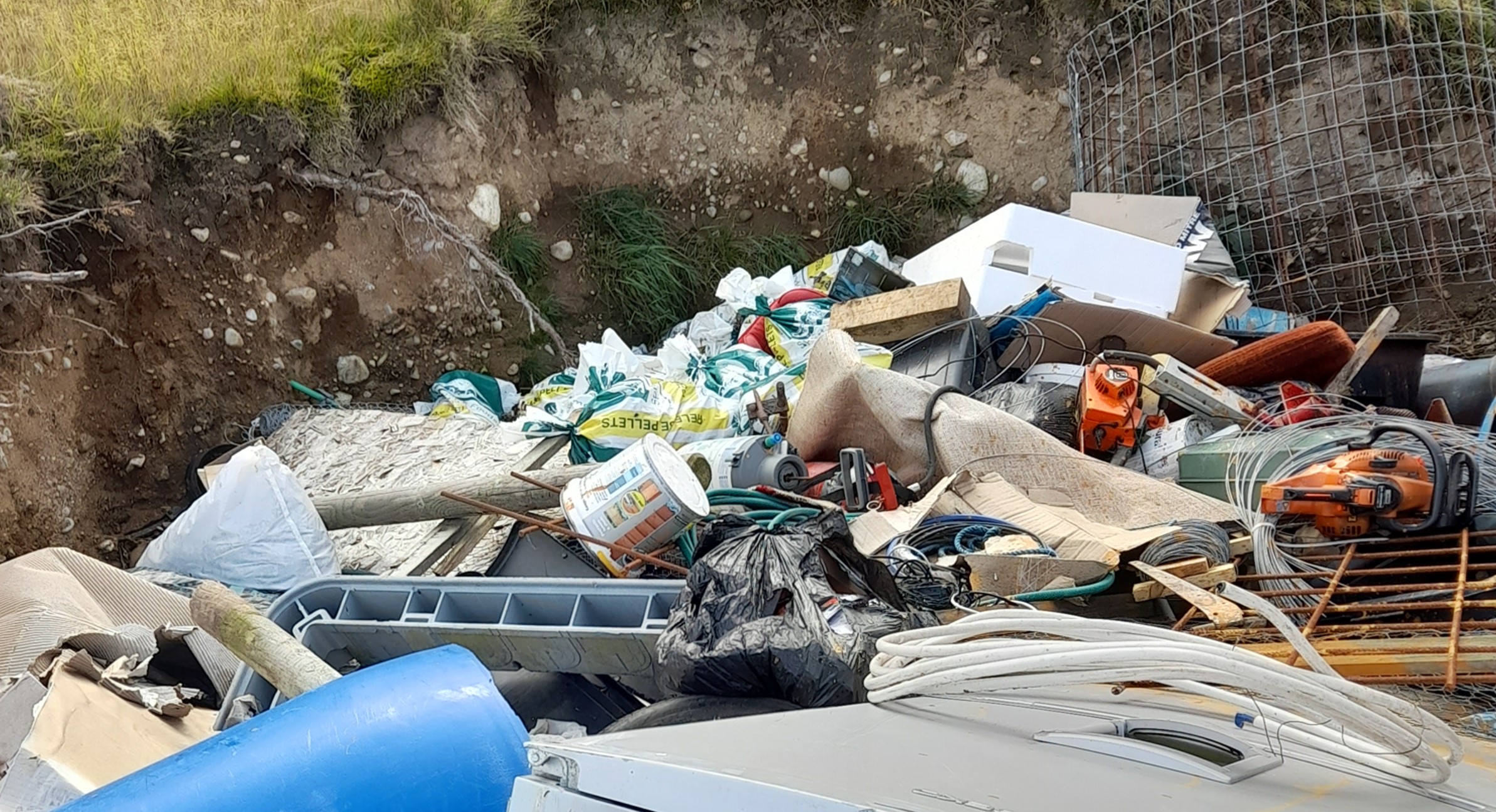 The photographs show items such as a large fridge, a chemical spray pump and barrel, a tyre, textiles, plastics, wood, cardboard, electrical equipment, metals, and a large number of white/green/yellow plastic sacks that had been zip-tied.