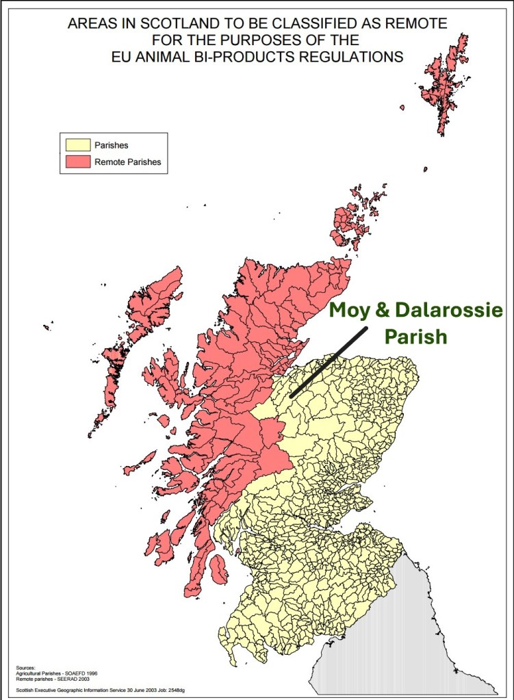If there are also dead gamebirds, there are different rules for the disposal of animal by-products (see above commentary on the pit at Glenbanchor & Pitmain Estate). There are some exemptions that permit burial, and it’s not clear to me whether any apply to this site, but the exemption available for areas classified as ‘remote areas’ in Scotland do not apply here, because the parish of Moy & Dalarossie is outside the classified area.