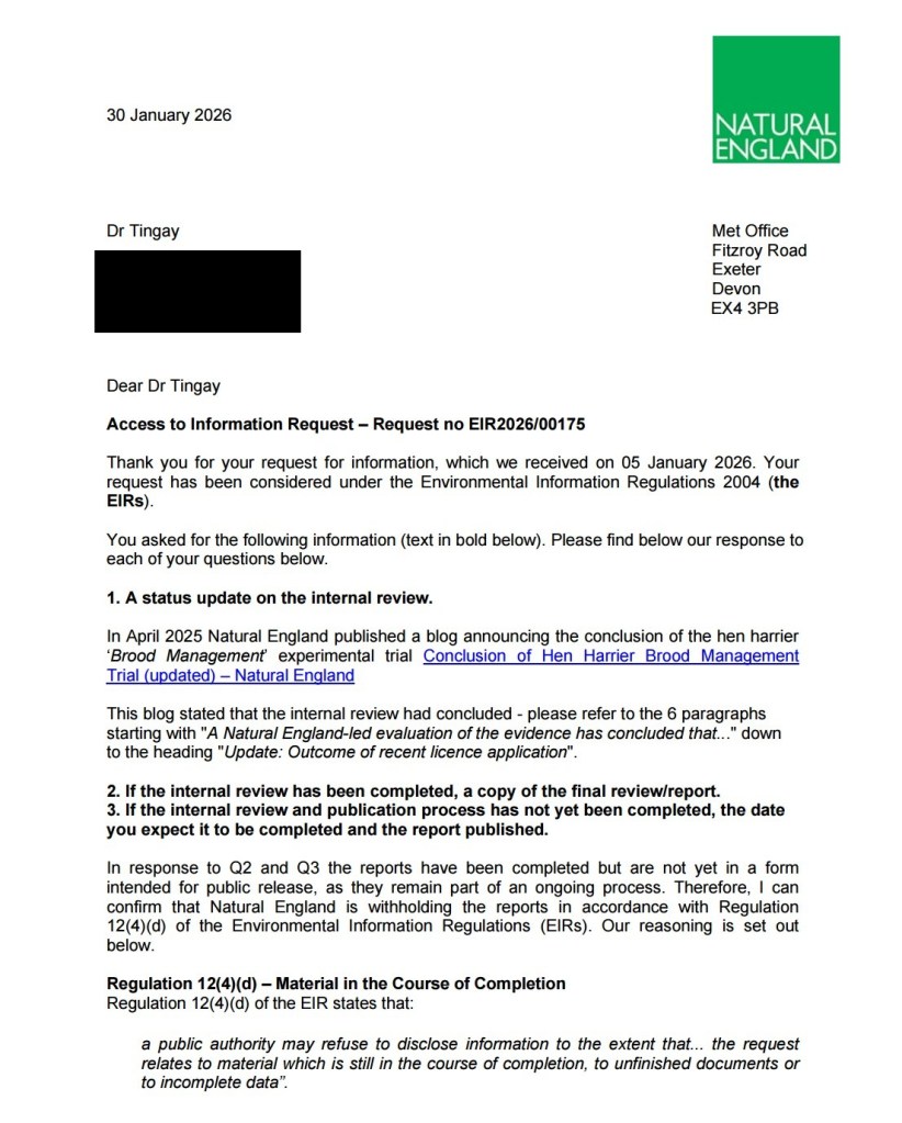 Natural England’s long overdue review of the Hen Harrier Brood Meddling trial will apparently be “concluded by spring 2026“, according to a recent Freedom of Information request.