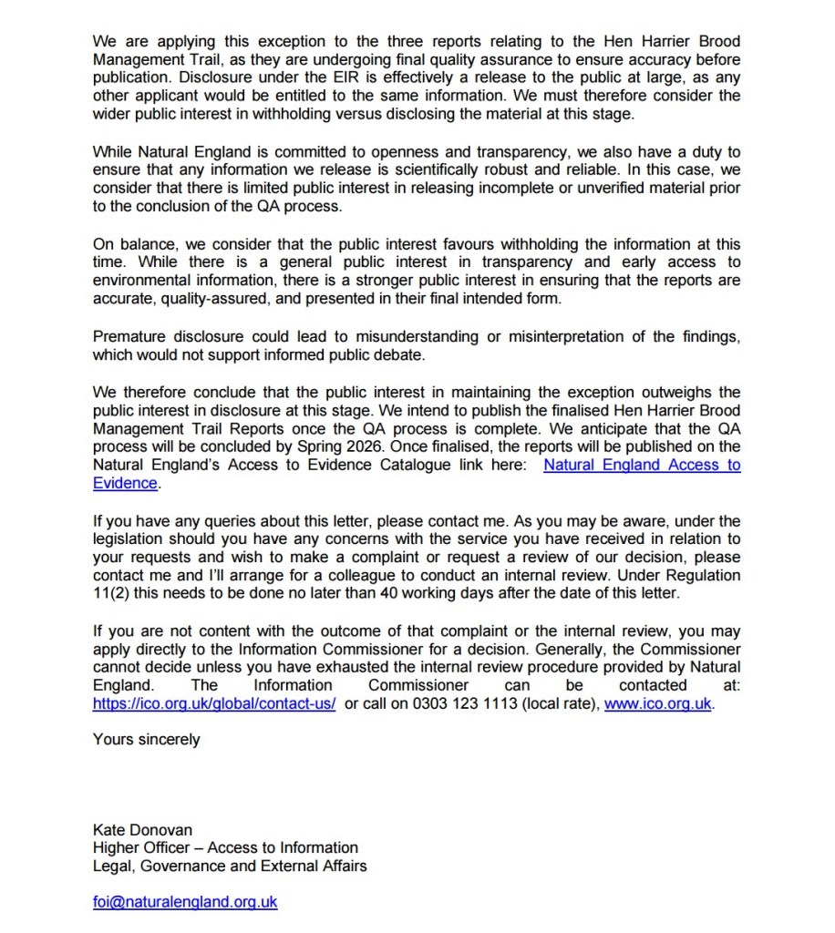 These documents are going to be sensational, eh, having being subjected to ‘draft analysis and review‘, then a ‘final draft stage‘, then an ‘internal review‘, and then a ‘final quality assurance‘ process, all of which has so far taken Natural England at least 19 months to complete, and it’s now been 2.7 years since the last Hen Harrier chick was brood meddled (in 2023).