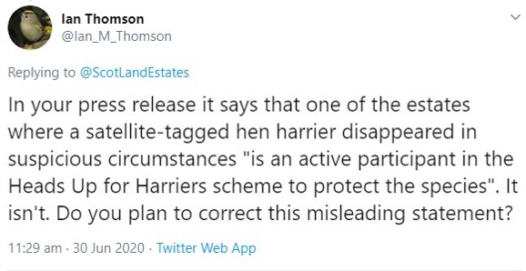 Yesterday we learned that two more satellite-tagged hen harriers, Hoolie and Marlin, had both ‘disappeared’ in suspicious circumstances from grouse moors in the Cairngorms National Park in April 2020 (see here). We also learned that they both vanished on exactly the same grouse moors from where two other satellite-tagged hen harriers had also disappeared without trace (Hen harrier ‘Lad‘ in 2015 and Hen harrier Marci in 2019).