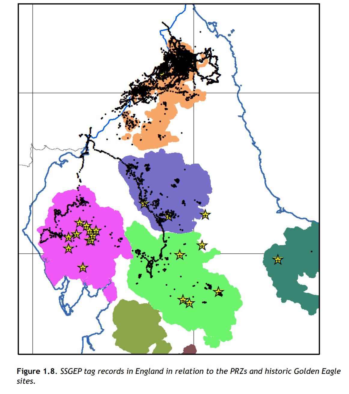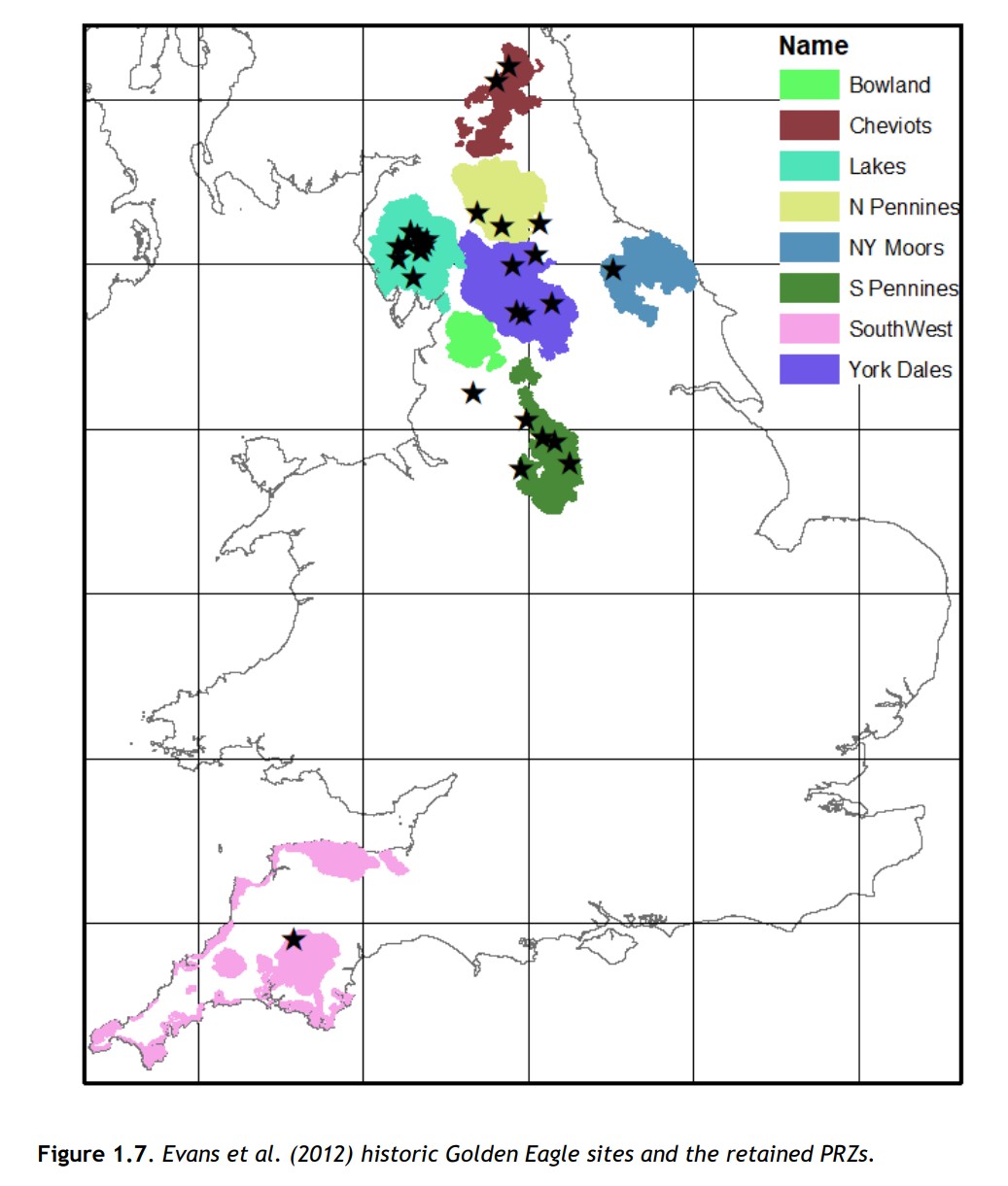 The North York Moors and the South West PRZs were considered to be geographically isolated (in terms of eagle dispersal) whereas the other six PRZs were considered as a single spatial block and therefore more preferable.