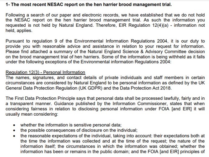 In relation to Q1, I was somewhat surprised to learn that NE ‘does not hold the NESAC report on the hen harrier brood management trial‘.