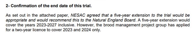 Eh? Does that mean the NESAC hasn’t produced an assessment/evaluation report? If it hasn’t, who has? I’ve since submitted a further FoI request to determine if anybody at NE has produced a report, and if so, where is it? Surely someone has produced an assessment report, otherwise how on earth has NE assessed the application to extend the trial?!
