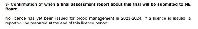 I’ve since submitted a further FoI request to determine if anybody at NE has produced a report, and if so, where is it? Surely someone has produced an assessment report, otherwise how on earth has NE assessed the application to extend the trial?! NE’s FoI response is due on 7th June 2023, although judging by NE’s continued obfuscation and lack of transparency (on which, more soon), I fully expect them to respond by telling me my information request is ‘complex’ and therefore they require a further 20 working days to complete the task. Let’s see.