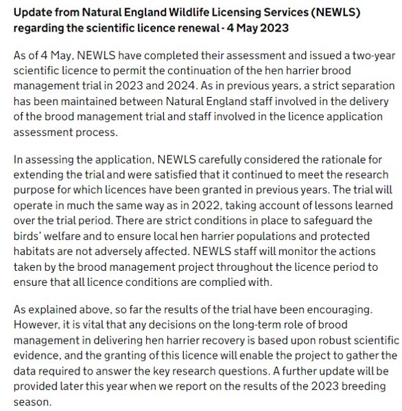 In addition to asking NE for a copy of any assessment report on the hen harrier brood meddling trial, I have also submitted FoIs requesting a copy of the licence application for the 2023/24 licence extension and a copy of the actual licence.