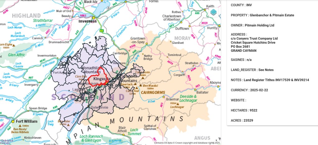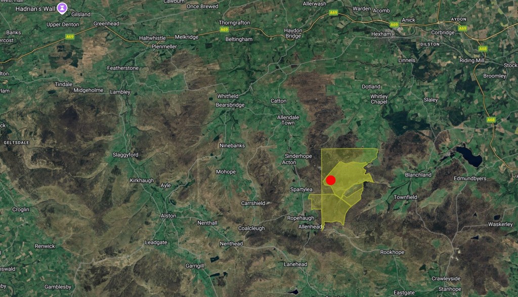 According to Guy Shrubsole’s excellent website, Who Owns England?, this grid reference (approximately marked as a red dot on map below) sits on property described as part of the Allendale Settled Estates: