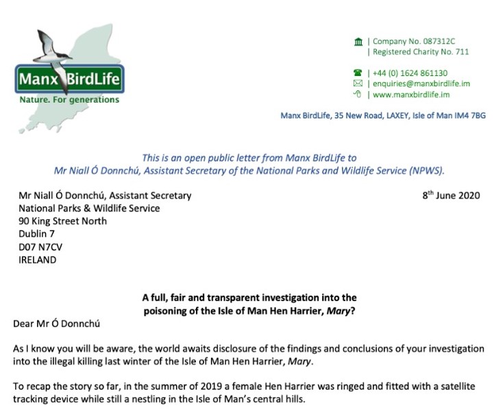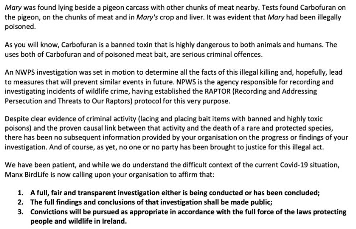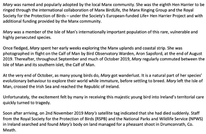 November 2019: Hen harrier Mary found illegally poisoned on a pheasant shoot in Ireland (here)