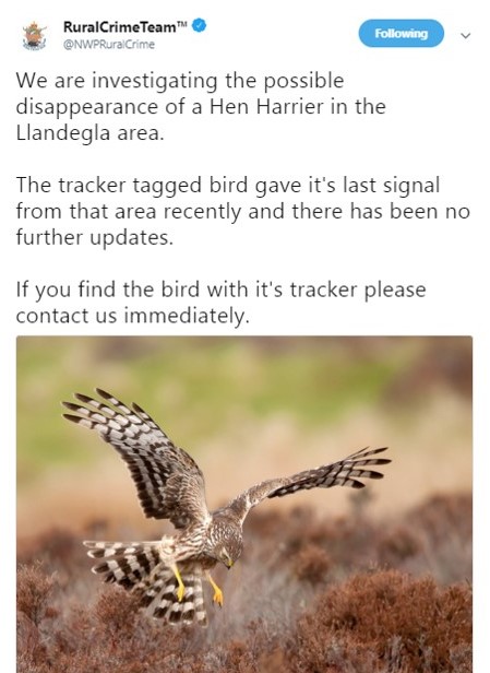 North Wales Police and the RSPB are appealing for information following the disappearance of a satellite-tagged hen harrier near Wrexham.