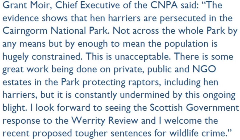 It’s a strong statement in as much as the CNPA CEO recognises and fully accepts that these wildlife crimes continue in some areas of the National Park, which is in stark contrast to statements made by the grouse shooting industry reps today (more on this later) but it doesn’t offer a solution. It’s more of an exasperated shrug of the shoulders and a heavy reliance on the Scottish Government to respond well to the Werritty Review.