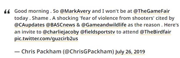 The threat of violence to Chris is very, very real. Charlie Jacoby of Fieldsports Channel Ltd knows this, as it was the reason why Chris (and Mark Avery) were ‘uninvited’ from speaking with Jacoby at the Game Fair in 2019: