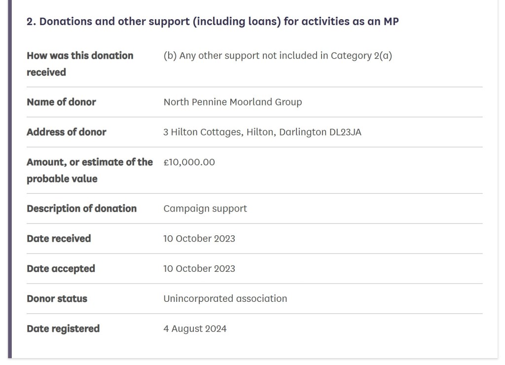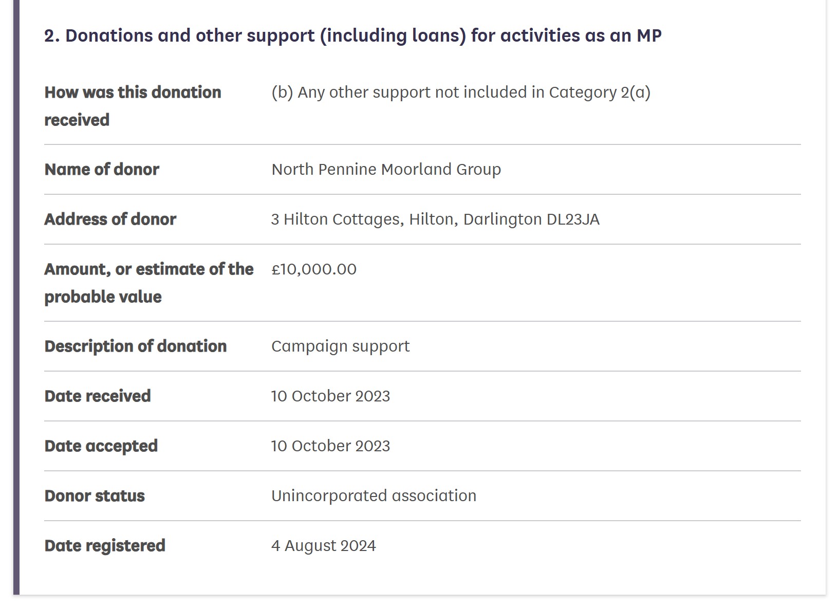 This entry reveals that Rushworth received a £10,000 donation from the North Pennine Moorland Group in October 2023, for ‘campaign support’. Imagine that!