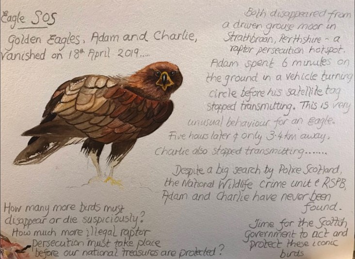 [An illegally killed satellite-tagged golden eagle, believed to have been trapped on a grouse moor in the Angus Glens resulting in its legs almost being severed, and then dumped in a layby several km away, inside the Cairngorms National Park, where it was left to die an horrific death. Photo by RSPB]