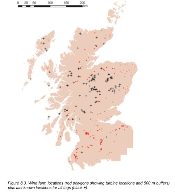 - Addressing the frequently heard accusation that wind farm technicians are removing and thereby ‘covering up’ the deaths of raptors that have been struck by a turbine blade, the report says: In Scotland this possibility seems remote given that: a) on incentive, the continued operation of no wind farm in Scotland is conditional on operational monitoring feedback in planning; b) technicians are not employed directly by the developer and are contracted independently by the turbine manufacturer and according to the projected lifespan of the wind farm; c) independent checks on reporting fatalities can be conducted at several wind farms by other contractors, and at least some developers (P. Robson pers. comm.) further blind-check these in staged exercises due to additional baseline legal requirements on environmental liability reporting; and d) many dead birds of prey (including tagged birds) have been routinely recorded incidentally by technical engineers and reported through several channels (e.g. Sansom et al. 2016, Urquhart & Whitfield 2016). In other words there are several checks and balances in Scotland to circumvent the possibility that carcasses of dead birds of prey would not be reported at wind farms and not disposed of once discovered (and even when relatively few birds will have been tagged). Nevertheless, our analyses were grounded to consider such a possibility; however remote.