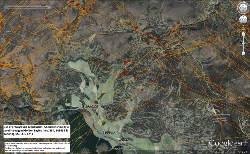 But back to the missing golden eagle #338. As we’ve been writing this blog, a very interesting map has appeared on Twitter (see @Ian_M_Thomson). It’s a map showing the recent movements of three other satellite-tagged golden eagles around Glenbuchat in March – April 2017: