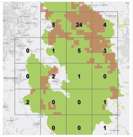 [RSPB map from the new scientific paper showing the number of confirmed raptor persecution incidents in the Peak District National Park 2000-2016 overlaid with areas managed for grouse shooting]: