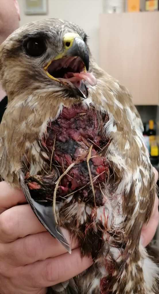 [This shot buzzard had to be euthanized due to the extent of its injuries. Photo by Peak District Raptor Monitoring Group]