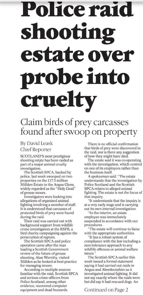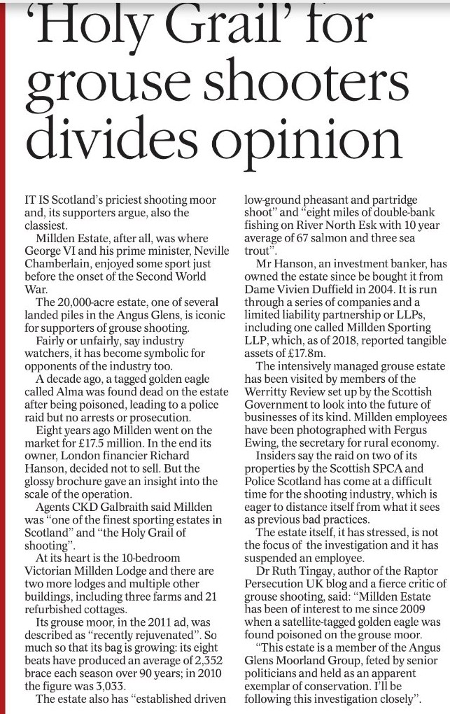 That’s an odd statement coming from the head keeper of perhaps one of the most intensively-managed grouse moors in the area. According to the Millden Estate sales brochures (2010 and 2011) great emphasis is placed on the record number of grouse that have been killed / are available to be killed and this is a prime selling point. Record bag sizes are also apparently the main reason the estate owner decided to withdraw his estate from sale in 2011 (see here).