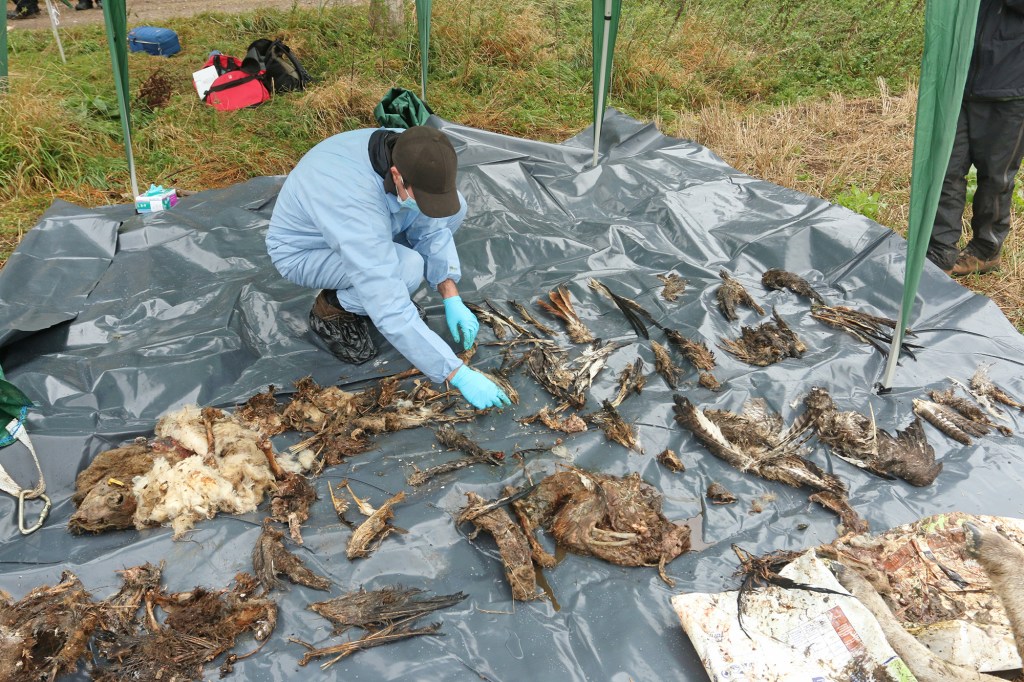 [Examination of the carcasses as they were exhumed from the well. Photo by Guy Shorrock/RSPB]