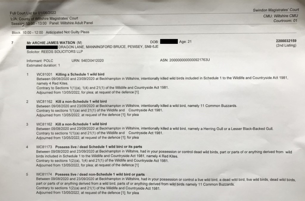 On 1 June 2022 at Swindon Magistrates Court gamekeeper Archie Watson (21) of Dragon Lane, Manningford Bruce, Pewsey received a 12-month community order to carry out 180 hours unpaid work and was ordered to pay £393 costs and £95 surcharge for pleading guilty to raptor persecution offences relating to the discovery in 2020 of at least 11 buzzards, four red kites and one gull species that had been dumped down a well on Galteemore Farm, a pheasant-shooting venue in Wiltshire.