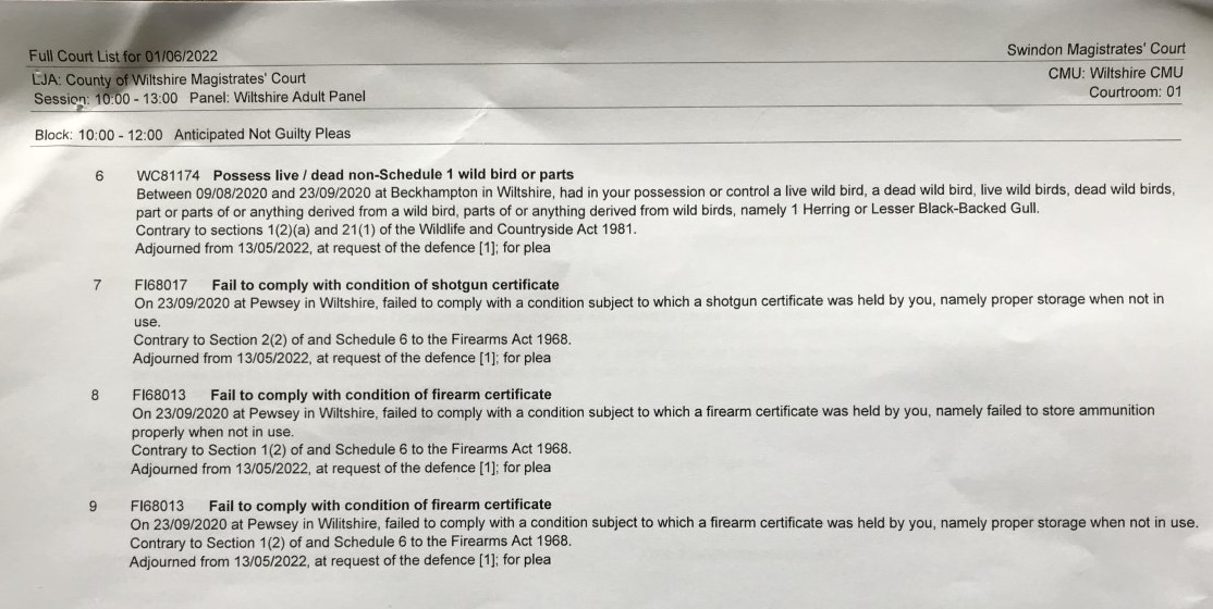It was also asked why Watson had not reported finding the BTO leg rings to the appropriate authorities or even the BTO themselves to which the defence only replied that there was “no statutory obligation to report” this. It was also made clear that the number of birds Watson was being charged with being in possession of was reduced to 5 buzzards, 3 Red Kites and the Gull. No explanation was given for this.