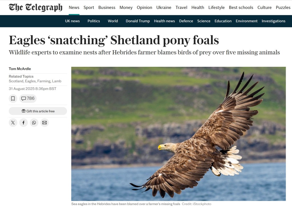 It’s just the latest in a long history of baseless accusations made about this species, although this is the first time that the eagles have been accused of taking Shetland ponies – usually they’re accused of being a threat to babies and toddlers (e.g. see here and here), which of course feeds into sensationalist headlines that editors know will sell copy.