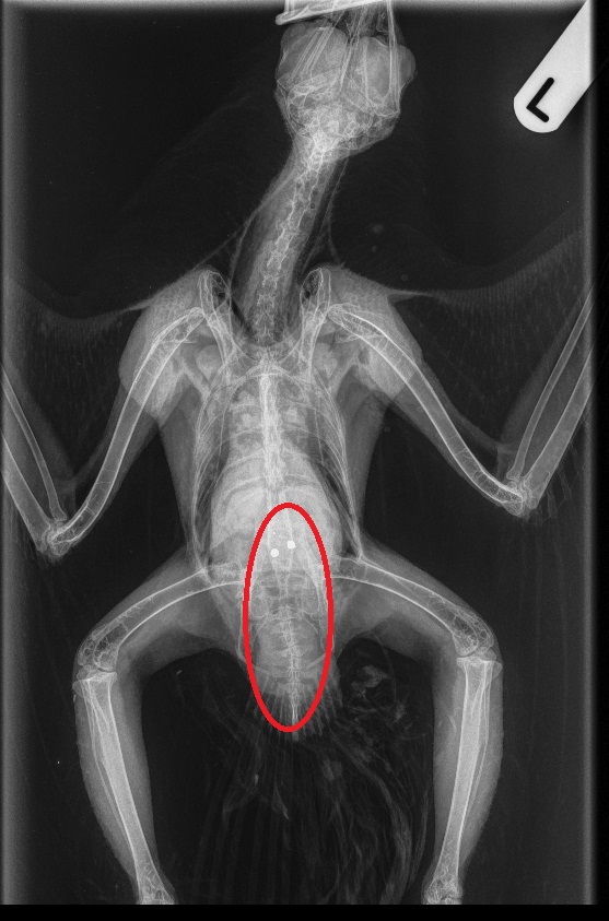 On examination it was clear there they weren’t the best of condition not least the tail position, which was to the side and the bird wasn’t able to move it. X-rays have confirmed that not only was the tail broken, but there are several shot gun pellets lodged in the bird. It is probable that they have been shot and the broken tail is a result of the bird crash landing.
