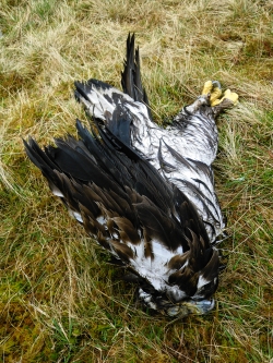 APRIL 2011: The body of a white-tailed eagle was found at the base of cliffs on Skye. The person who discovered it (a professional medic) considered it to have been freshly shot with a rifle, decapitated with a sharp implement and thrown from the cliff top. He took photographs and alerted Northern Constabulary and RSPB. There was a delay of two weeks before the now probably decomposed carcass was collected. A post-mortem was inconclusive. This incident was not made public until one year later after a tip off to this blog. We are not aware of any pending prosecutions.