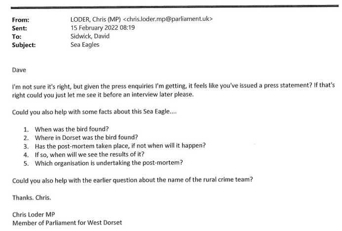 My FoI request to the Dorset PCC was made on 4th March 2022. After a long period of silence (and thus a breach of the Freedom of Information Act), the PCC finally responded and sent me copies of some correspondence between PCC David Sidwick and Chris Loder MP about this poisoned eagle.